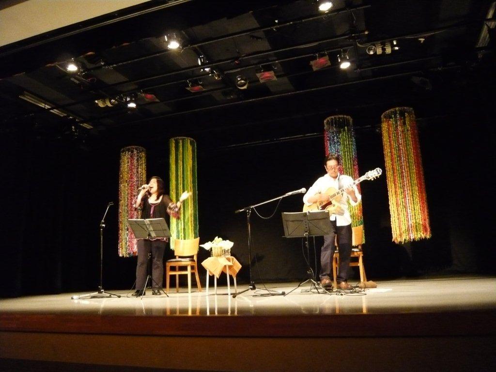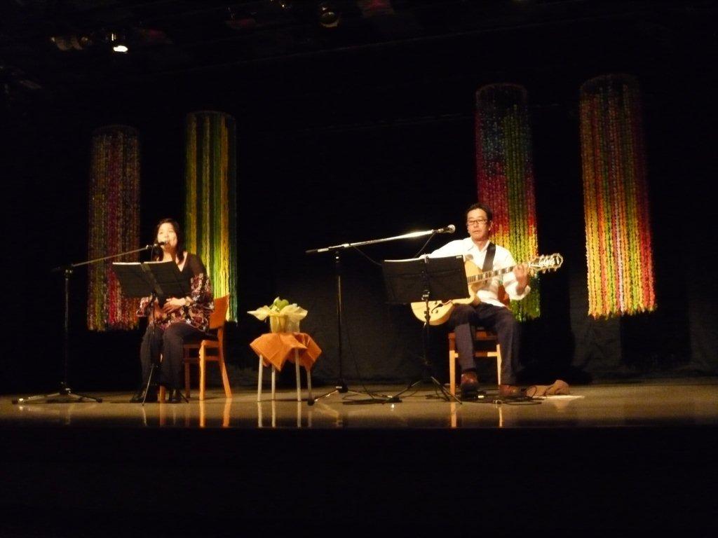 ◎里美コメント◎ へんり未来さんにご紹介いただき、ギタリストの伊藤茂利さんとの初のライブでした。伊藤さんのギターの音色とリズム♪素晴らしかったです!「アオギリにたくして」「いのちの音色」「忘れないよいつまでも」「ムーンライト」「大切に思うこと」の5曲を歌わせていただきました♪最後の曲「大切に思うこと」では、ギタリストで俳優のコータさんが飛び入り参加して、ギターソロを奏でてくださいました!素晴らしい音色でした♪ |