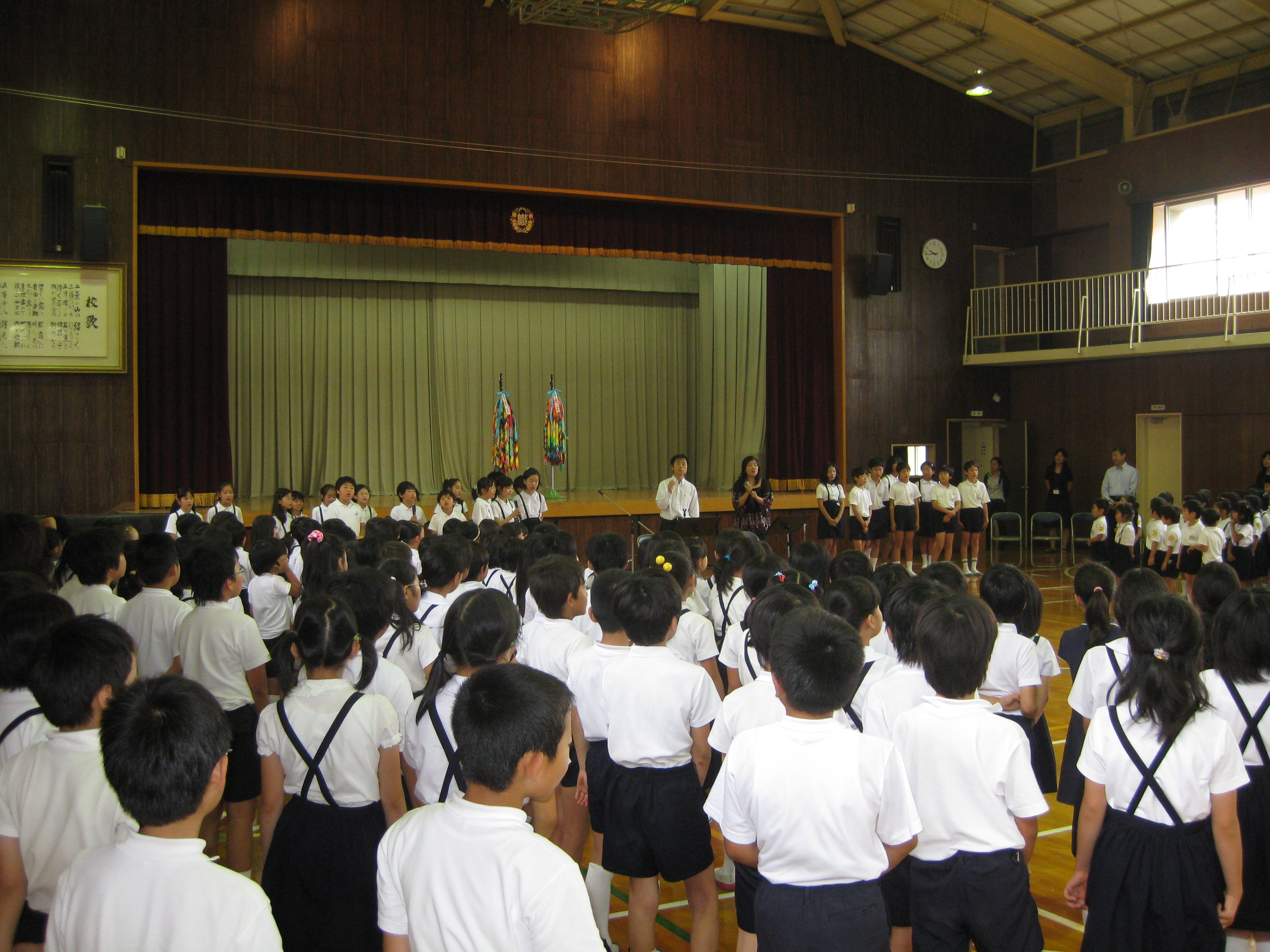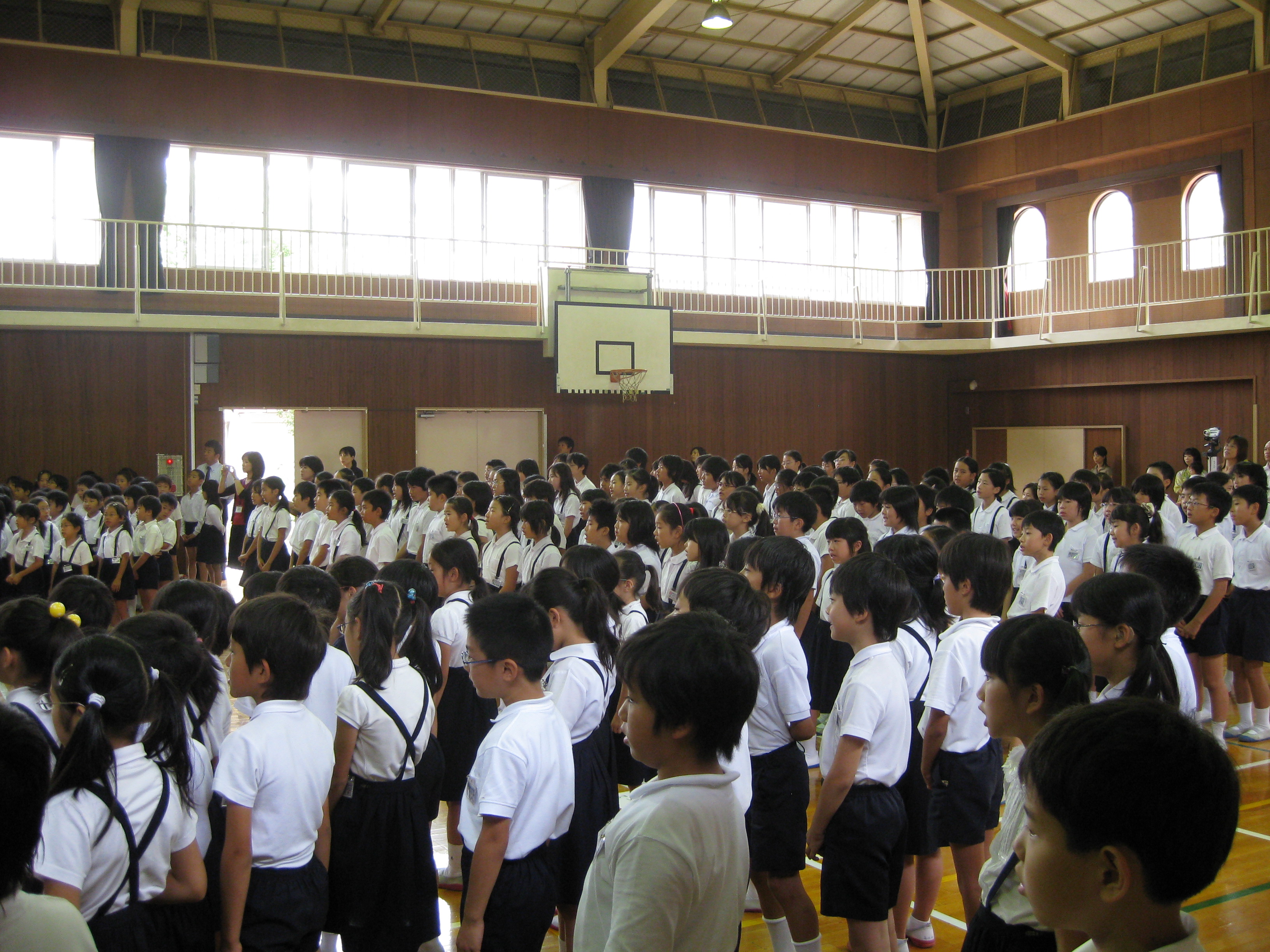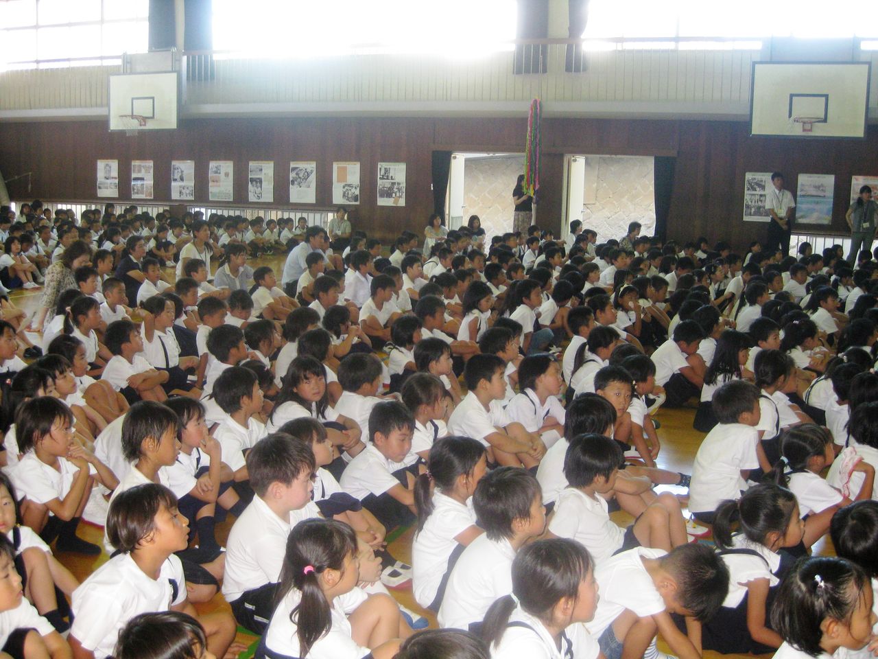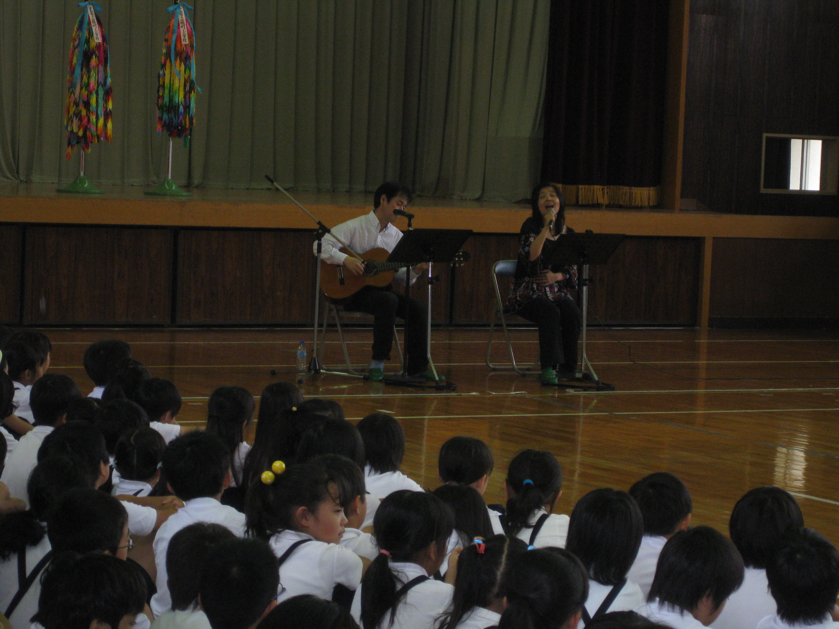 ◎里美コメント◎ 幟町小学校は、「原爆の子の像」ができるきっかけとなった佐々木禎子さんの通われていた小学校です。そこで行われる折り鶴集会に招かれて、「私のヒロシマ・ナガサキ」ライブをさせていただきました。 学校の前につくと、校長先生自ら校門に立って、登校してくる子供たち一人一人と朝の挨拶を交わされていました。校長先生の手に自 分の手をパチンと合わせて、元気いっぱいに「おはようございます!」と挨拶する子供たち。自分の小学校時代を思い出しながら、私も元気よく校長先生にごあいさつして学校の中に入りました。 子供たちの元気いっぱいのエネルギーがみなぎっている体育館で、403名の子供たちと出会う機会を与えていただき大感激でした。 最後には、みんなで一緒に三拍子に合わせて、佐々木禎子さんのお話を歌にした「おりづるにのって」を歌いました。1年生から3年生まで403名の大きな声が体育館いっぱいに広がって本当に感動的でした。みんな歌詞を3番まで全部覚えてくれていて、何も見ずに大きな声で元気いっぱい歌ってくれました。 生徒を代表してライブへの感想を言ってくださった6年生の女の子の言葉が胸にしみました。 「私にとって平和とは、ひろりぼっちを作らないこと。歌うことで、禎子さんや平和の大切さがとても身近にかんじられました」それを聞いて、涙が出そうになりました。 |