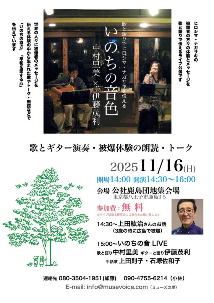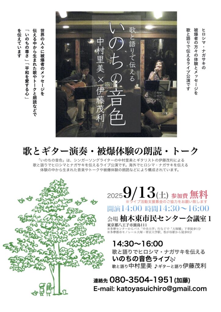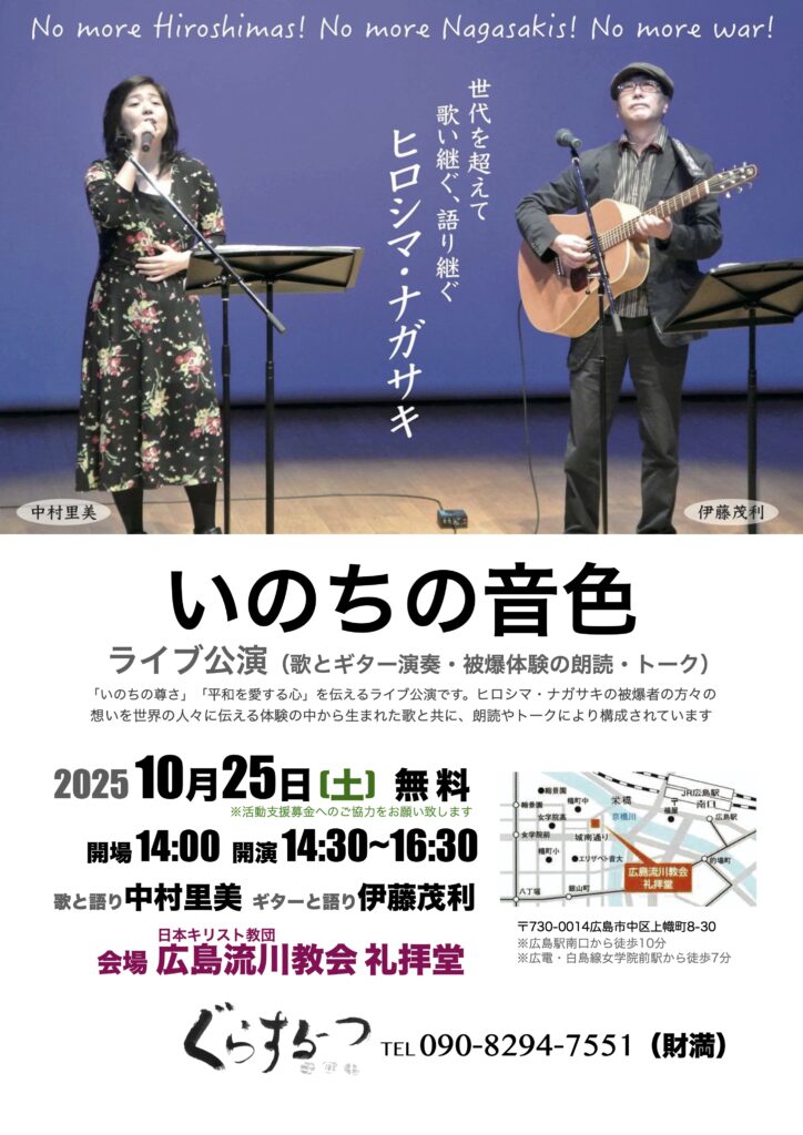 歌と語りでヒロシマ・ナガサキを伝える「いのちの音色」ライブが開催されます
