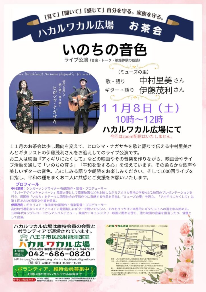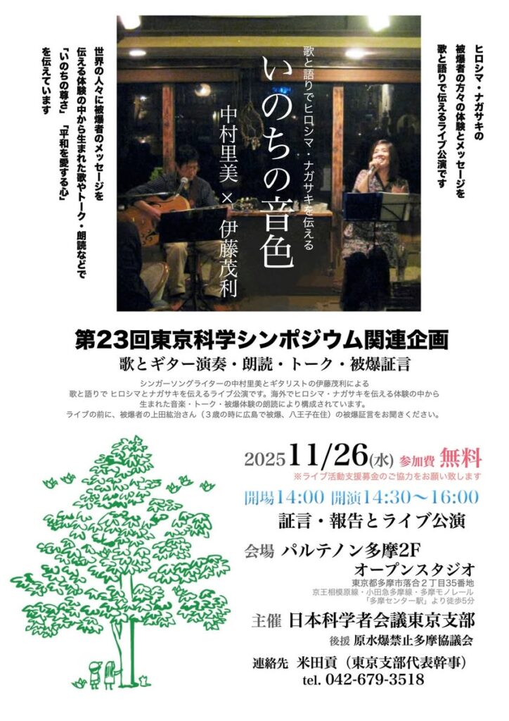 2025年春、東京八王子の神戸山 法泉寺の本堂にて、歌と語りでヒロシマ・ナガサキを伝える中村里美&伊藤茂利「いのちの音色」ライブと、ライブ後には私たちの初プロデュース映画『アオギリにたくして』を上映させていただきます。被爆の実相を伝えるパネル展も開催されます。
