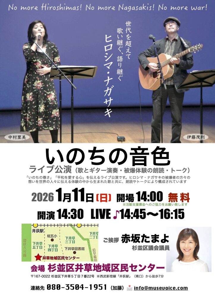 2026年初の歌と語りでヒロシマ・ナガサキを伝える「いのちの音色」ライブは、東京・杉並からスタートしていきます!本年もどうぞよろしくお願いいたします